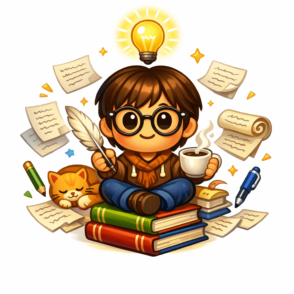 My emoji-image captures the warmth and creative spirit of a writer–the cozy books, the quill, the light bulb of inspiration, and even the little cat muse .